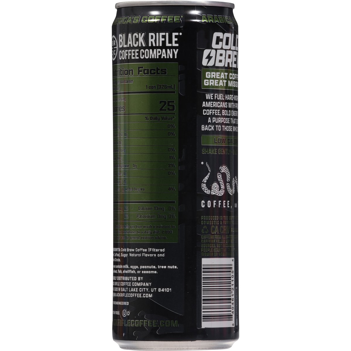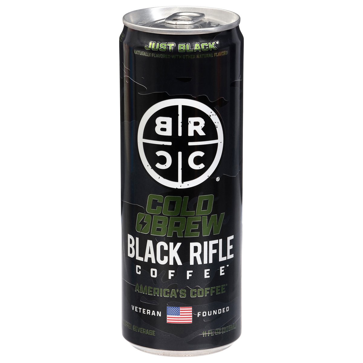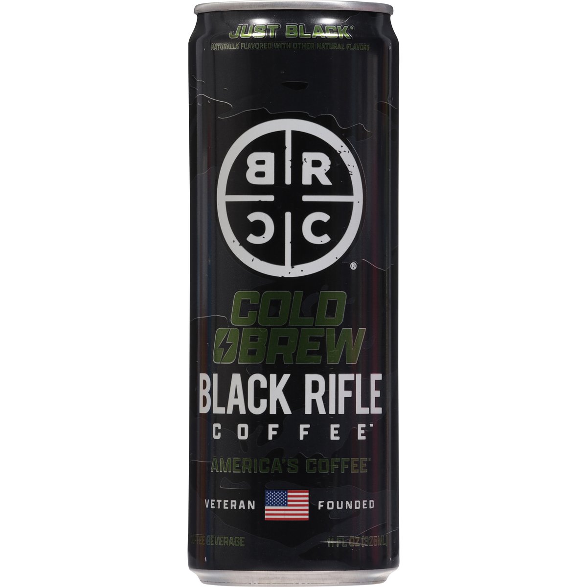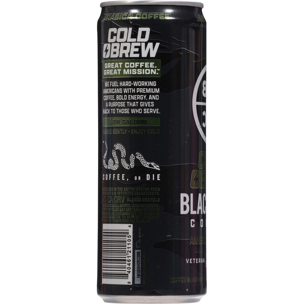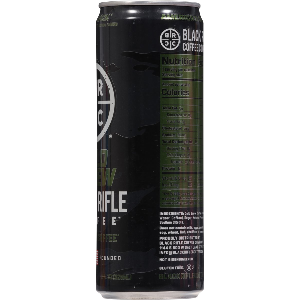 Naturally flavored with other natural flavors. Gluten free. Low calorie. Caffeine from all sources: 150 mg per serving. Not bioengineered. America's coffee. Veteran founded. Arabica coffee. Cold brew. Great coffee. Great mission. We fuel hard-working Americans with premium coffee, bold energy, and a purpose that gives back to those who serve. Coffee, or die. blackriflecoffee.com. info@blackriflecoffee.com. Please recycle. Produced in the United States from domestic & imported ingredients.