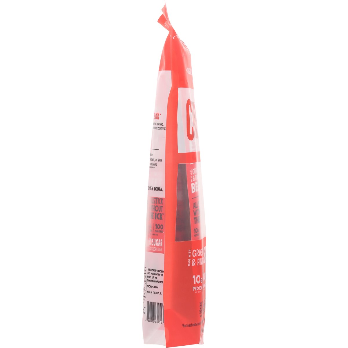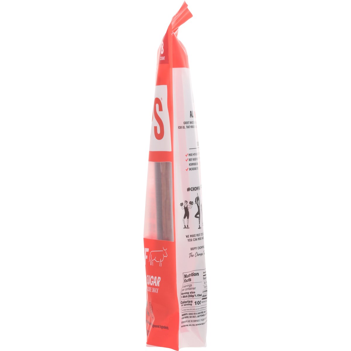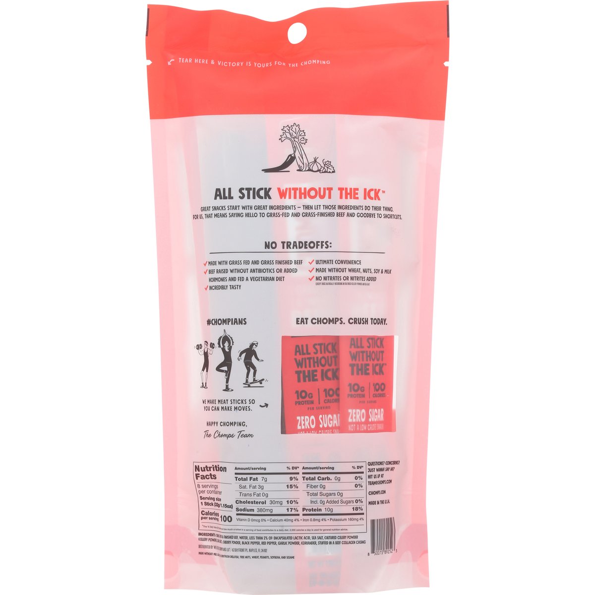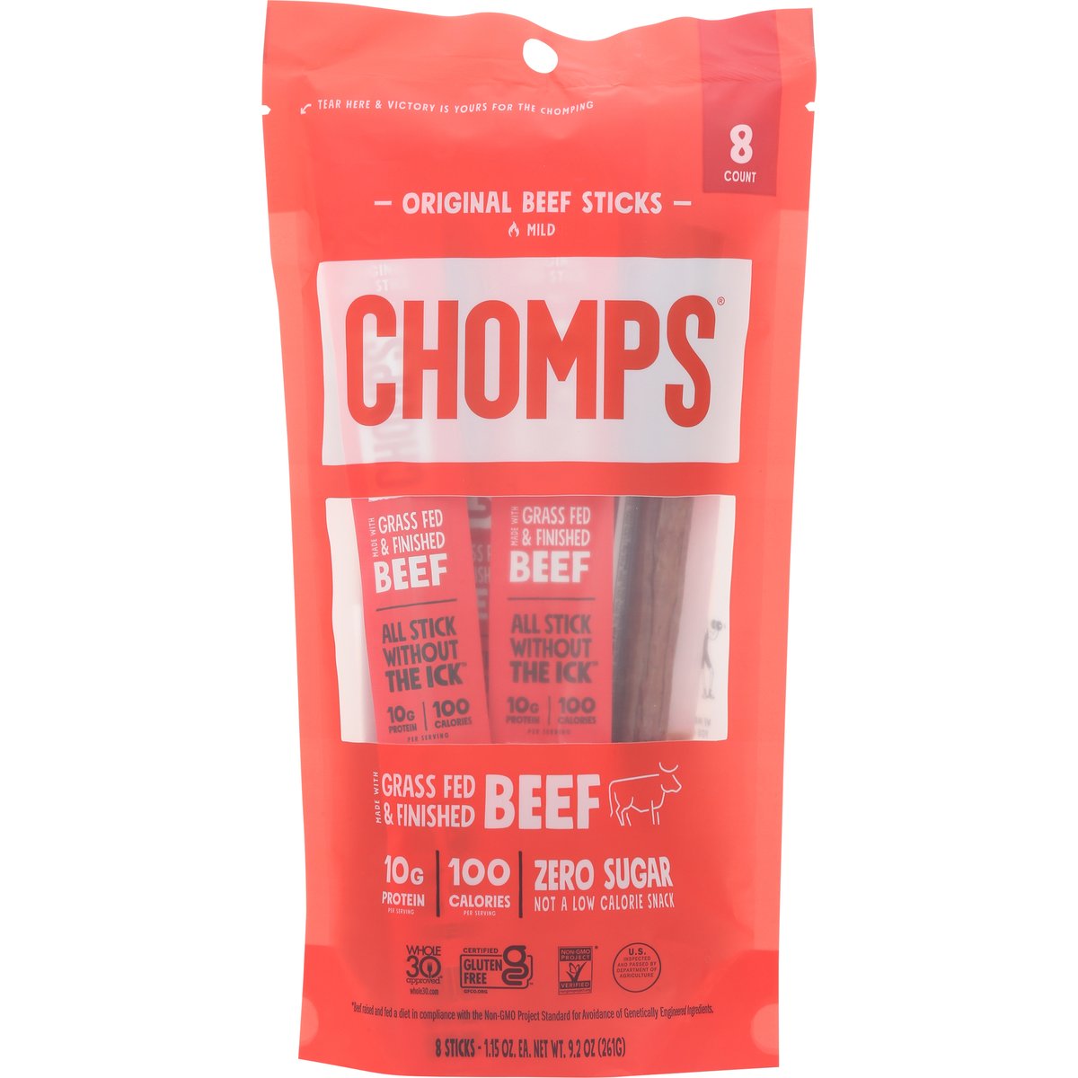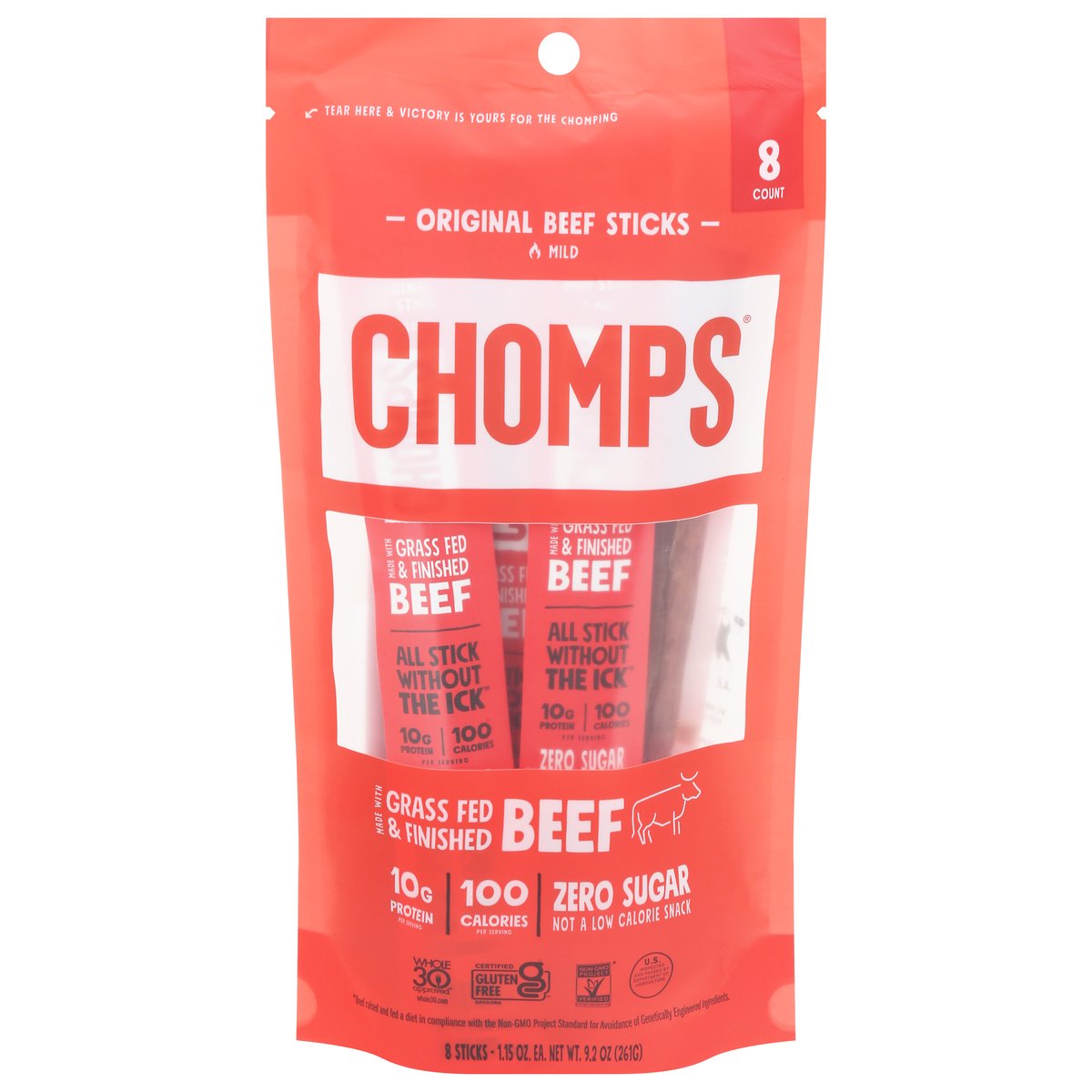 10 g protein per serving. 100 calories per serving. Certified gluten free. gfco.org. Zero sugar. Not a low calorie snack. Made without wheat, nuts, soy & milk. Made without: Milk. egg, fish, crustacean shellfish, tree nuts, wheat, peanuts, soybean, and sesame. Non-GMO Project verified. nongmoproject.org*. *Beef raised and fed a diet in compliance with the Non-GMO Project Standard for Avoidance of Genetically Engineered Ingredients. All stick. Without the Ick. Great snacks start with great ingredients - then let those ingredients do their thing. For us, that means saying hello to grass-fed and grass-finished beef and goodbye to shortcuts. Beef raised without antibiotics or added hormones and fed a vegetarian diet. Incredibly tasty. Ultimate convenience. No nitrates or nitrites added. Except those naturally occurring in cultured celery powder and sea salt. Eat chomps. Crush today. We make meat sticks so you can make moves. Happy chomping, - The Chomps Team. Whole 30 Approved. U.S. inspected and passed by Department of Agriculture. chomps.com. #chompians. Questions? Concerns? Just wanna say hi? Hit us up at team@chomps.com. Made in the U.S.A.