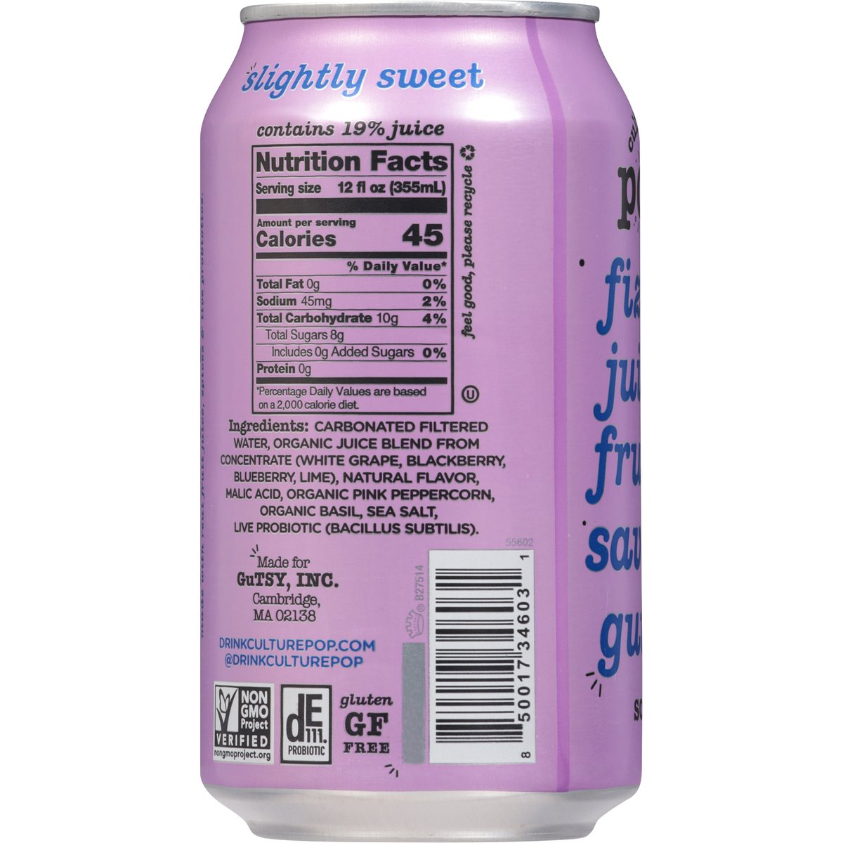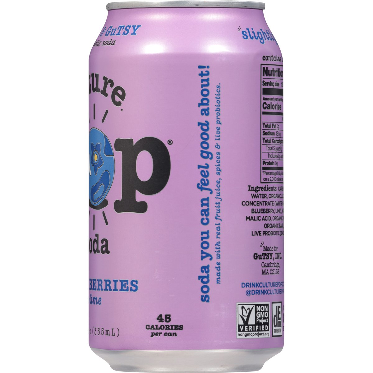 45 calories per can. Plant based & vegan. Gluten free. Non-GMO Project verified. nongmoproject.org. Fizzy & gutsy. Slightly sweet. dE111 probiotic. Fizzy, juicy, fruity, savory, gutsy. Soda you can feel good about! drinkculturepop.com. @drinkculturepop. Feel good, please recycle.