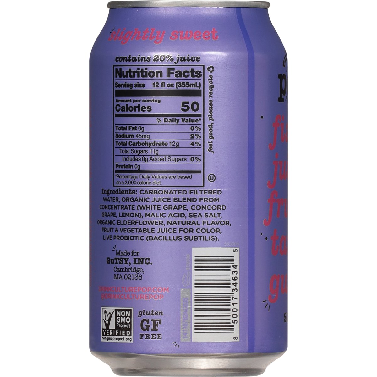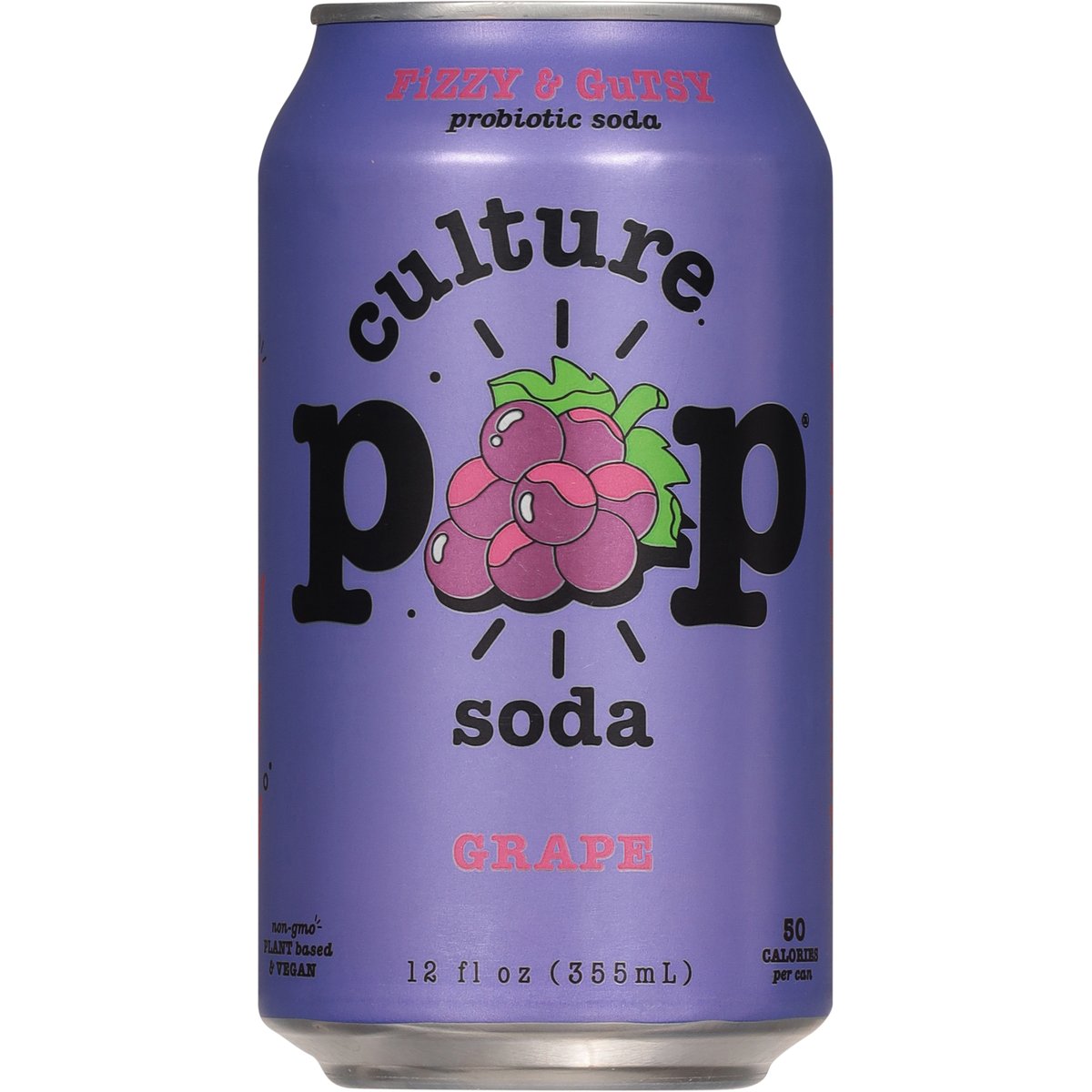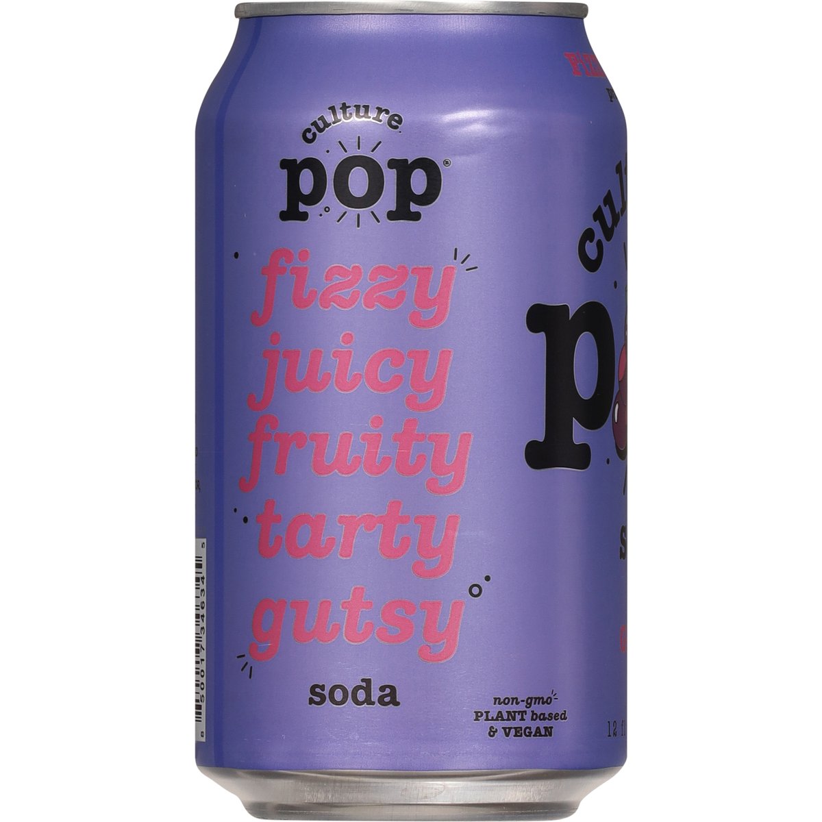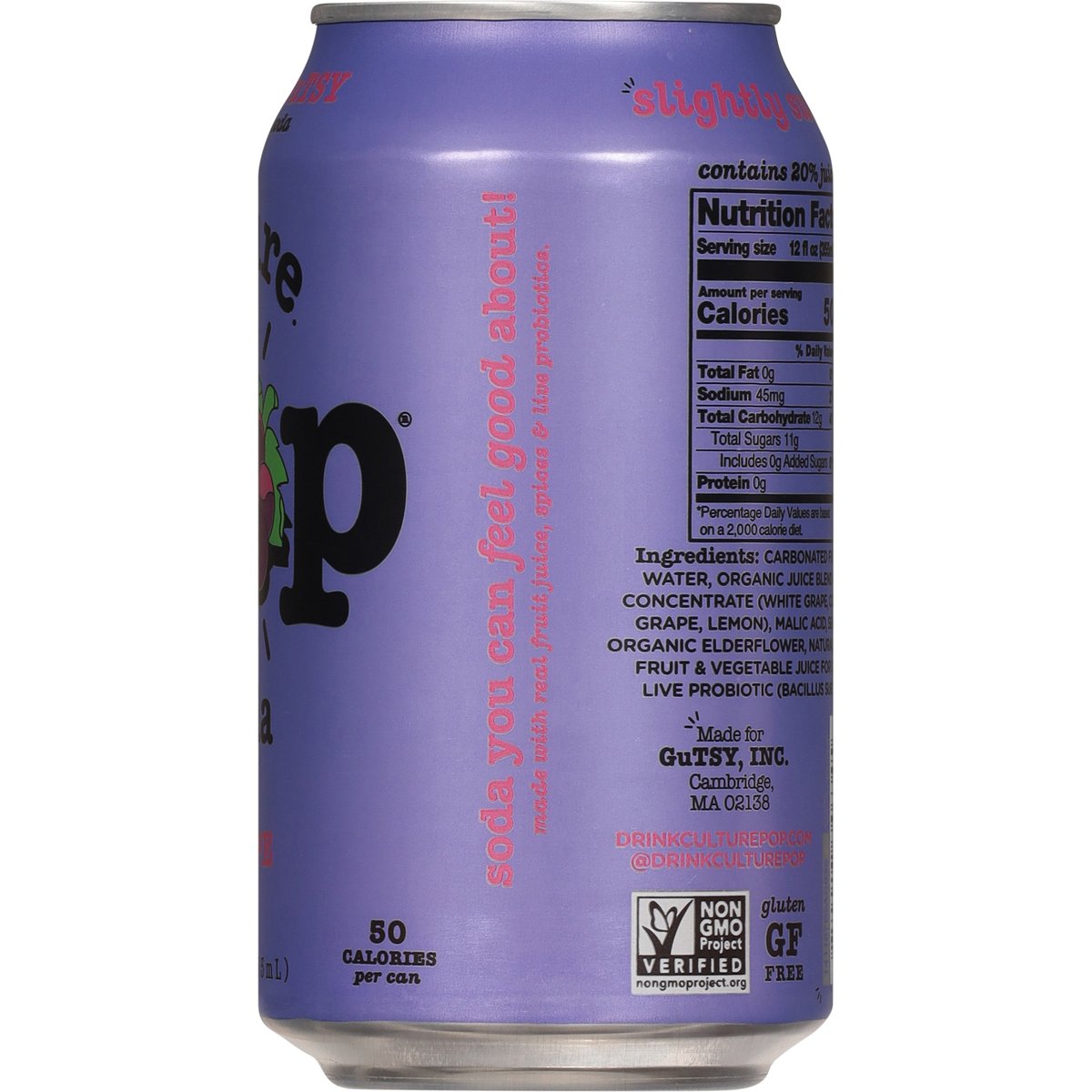 50 calories per can. Plant-based & vegan. Gluten free. Non-GMO. Non-GMO Project verified. nongmoproject.org. Fizzy & gutsy. Fizzy, juicy, fruity, tarty, gutsy. Soda you can feel good about! drinkculturepop.com. @drinkculturepop. Feel good, please recycle.
