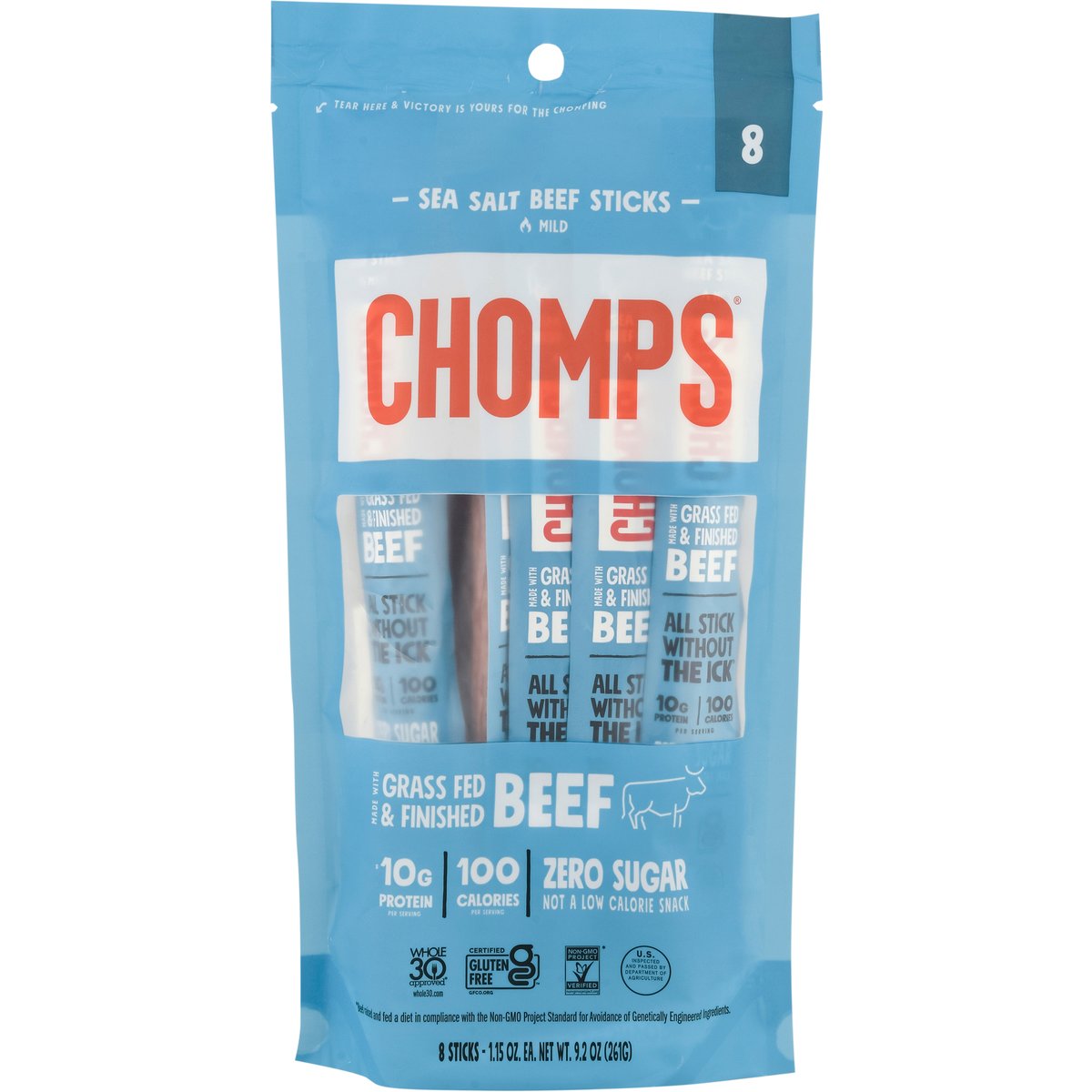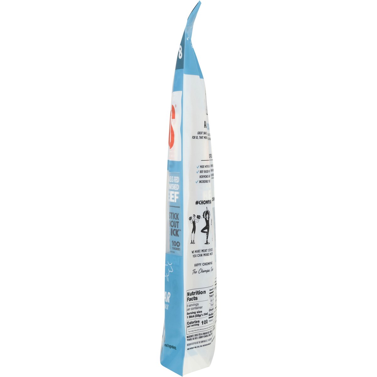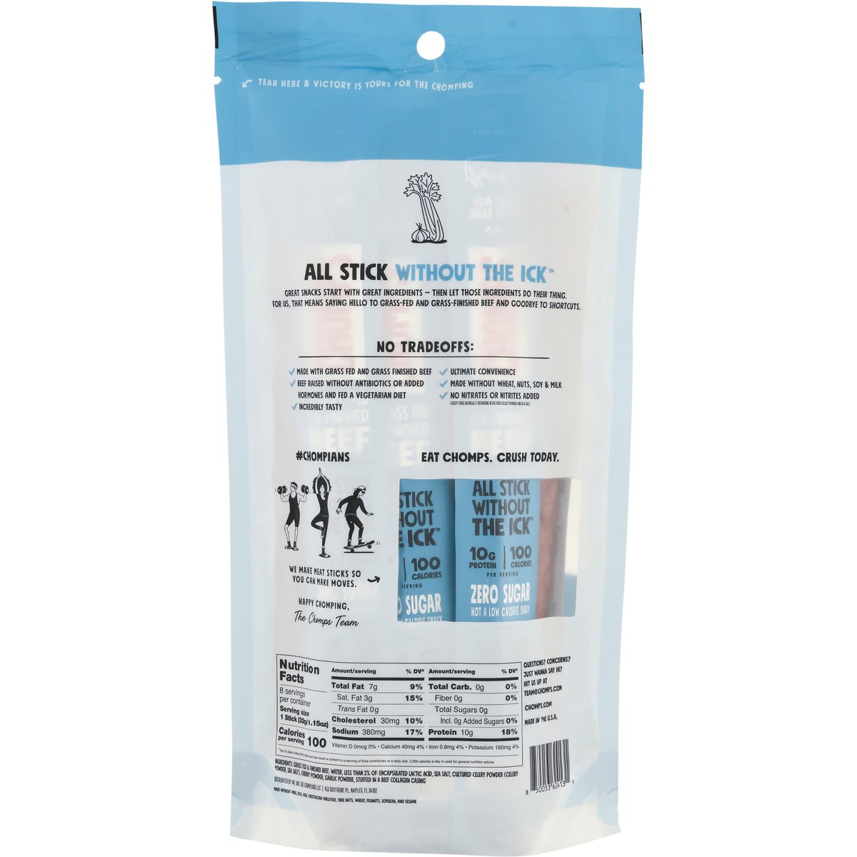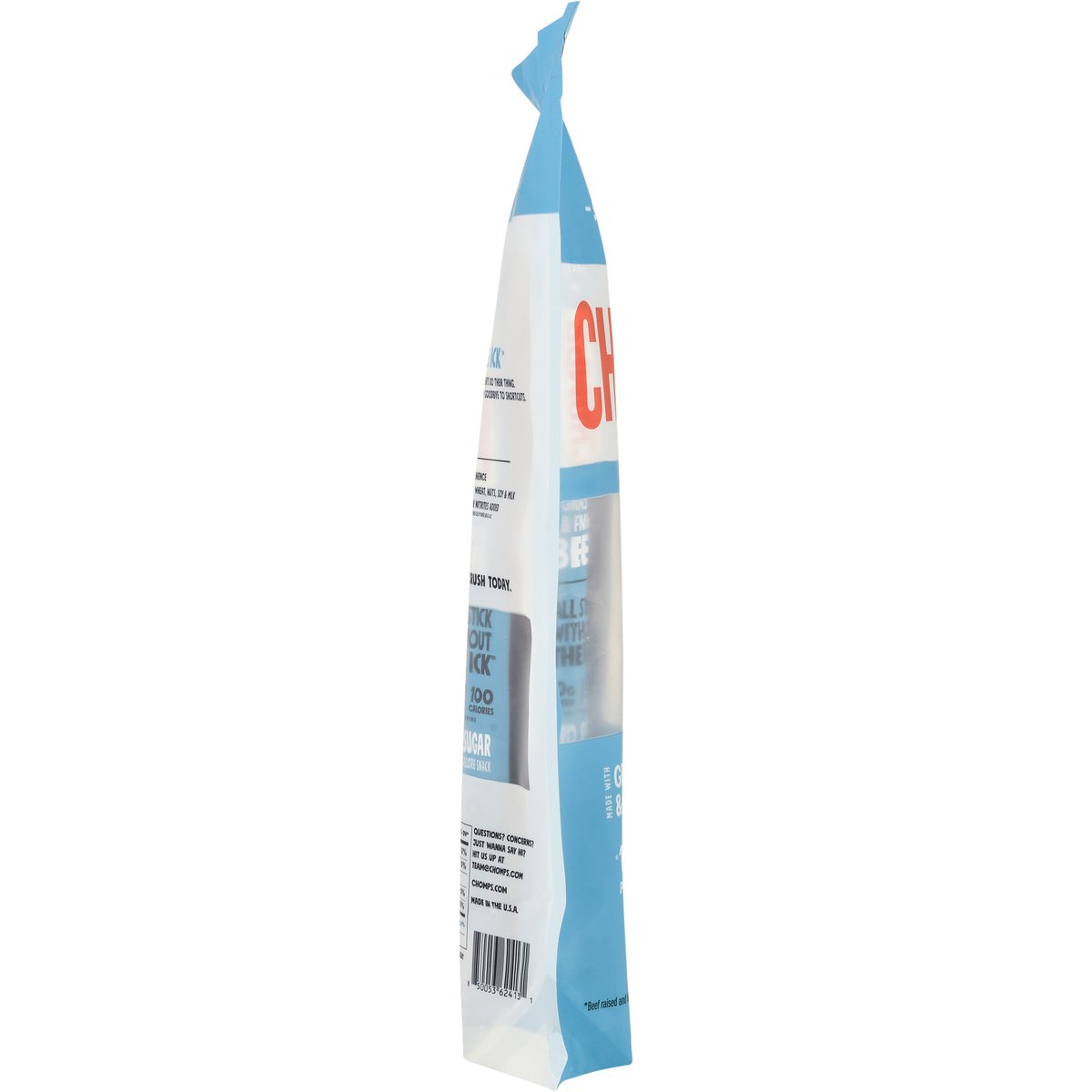 10 g protein per serving. 100 calories per serving. Certified gluten free. gfco.org. Zero sugar. Not a low calorie snack. Made without wheat, nuts, soy & milk. Made Without: Milk, egg, fish, crustacean shellfish, tree nuts, wheat, peanuts, soybean, and sesame. Non-GMO Project verified. nongmoproject.org.* * Beef raised and fed a diet in compliance with the Non-GMO project standard for avoidance of genetically engineered ingredients. All stick without the Ick. Great snacks start with great ingredients - then let those ingredients do their thing. For us, that means saying hello to grass fed and grass finished beef and goodbye to shortcuts. No tradeoffs: Made with grass fed and grass finished beef. Beef raised without antibiotics or added hormones and fed a vegetarian diet. Incredibly tasty. Ultimate convenience. No nitrates or nitrites added. Except those naturally occurring in cultured celery powder and sea salt. We make heat sticks so you can make moves. Happy chomping, The Chomps Team. Eat chomps, crush today. Whole 30 Approved. whole30.com. U.S. inspected and passed by Department of Agriculture. chomps.com. #chompians. Questions? Concerns? Just wanna say hi? Hit us up at team@chomps.com. Made in the U.S.A.