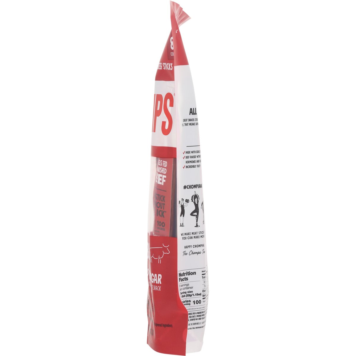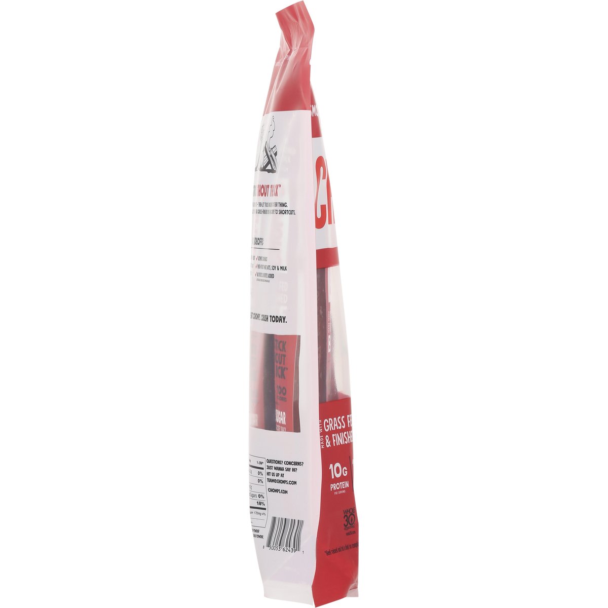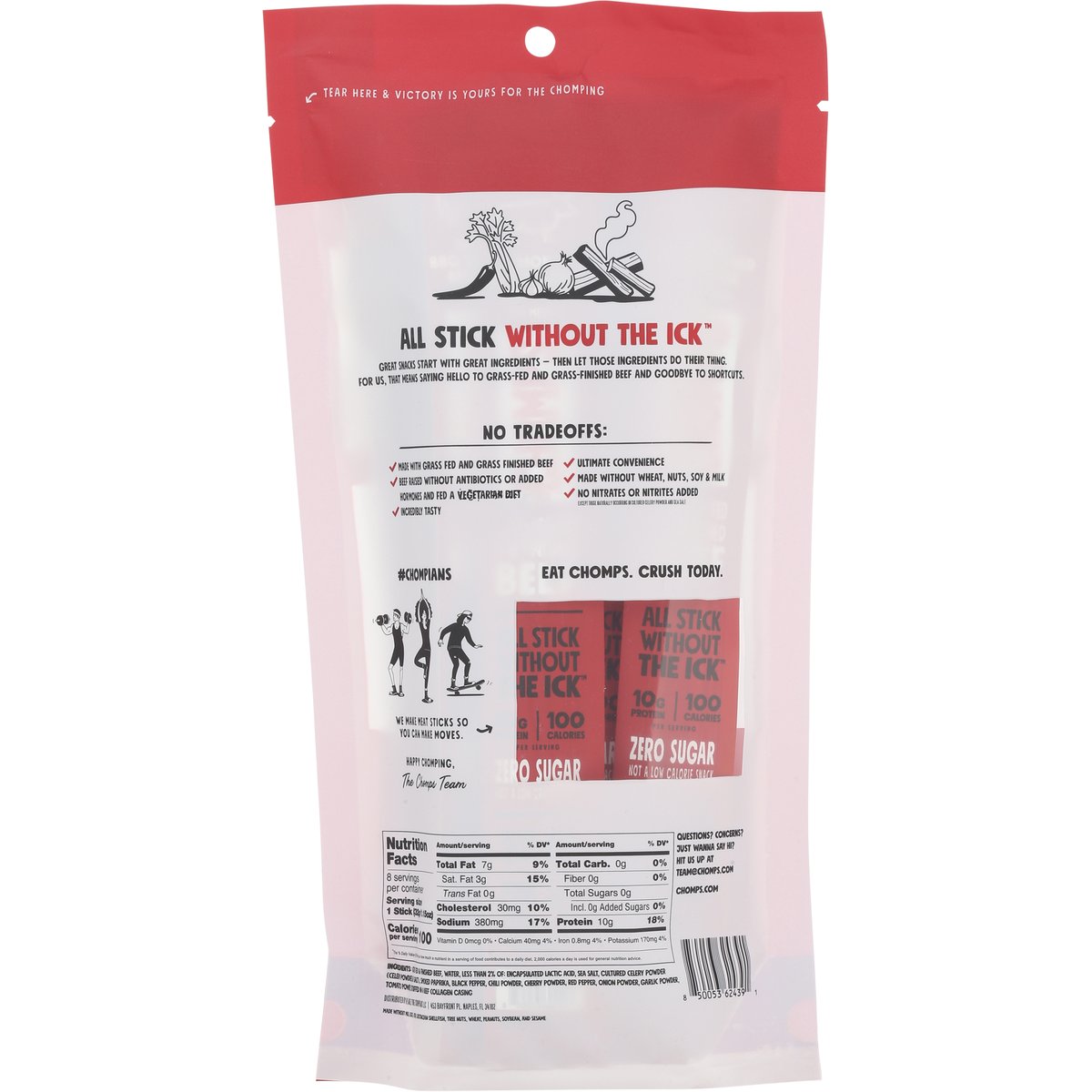 10 g protein per serving. 100 calories per serving. Certified gluten free. gfco.org. Made without wheat, nuts, soy & milk. Zero sugar. Not a low calorie snack. Non-GMO Project verified. nongmoproject.org*. * Beef raised and fed a diet in compliance with the Non-GMO Project Standard for Avoidance of Genetically Engineered Ingredients. All stick without the ick: great snacks start with great ingredients then let those ingredients do their thing. For us, that means saying hello to grass-fed and grass-finished beef and goodbye to shortcuts. No tradeoffs: Beef raised without antibiotics or added hormones and fed a vegetarian diets. Incredibly tasty. Ultimate convenience. No nitrates or nitrites added. Except those naturally occurring in cultured powered and sea salt. Eat chomps. Crush today. We make heat sticks so you can make moves. Happy chomping. The champs team. Whole 30 Approved. U.S. inspected and passed by Department of Agriculture. chomps.com. #chompians. Questions? Concerns? Just wanna say hi? hit us up at team@chomps.com.