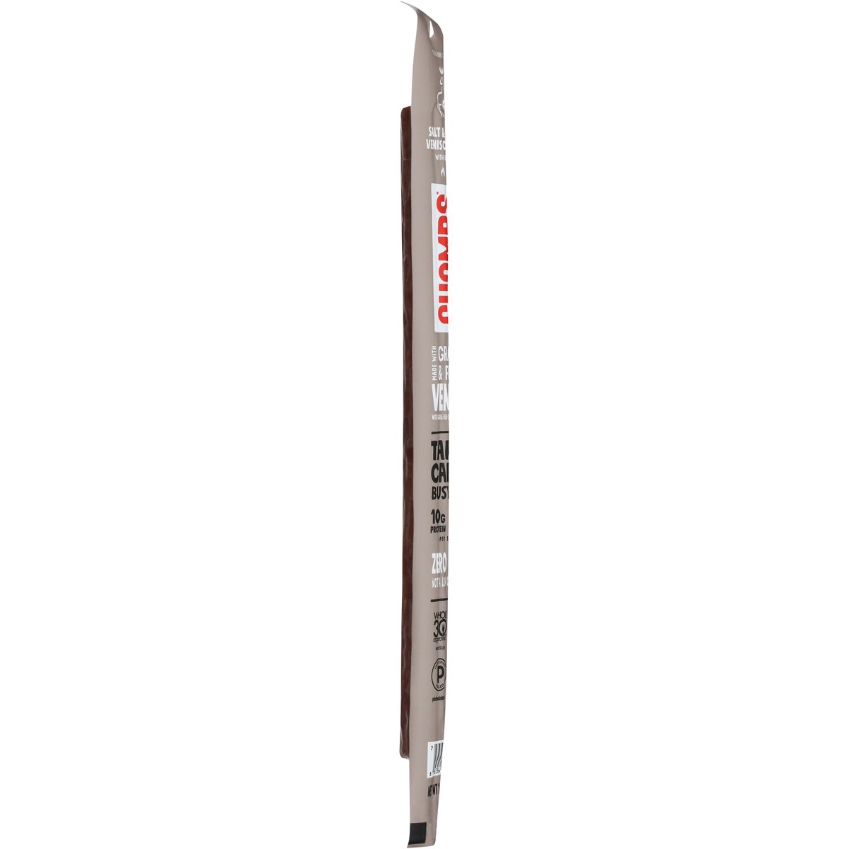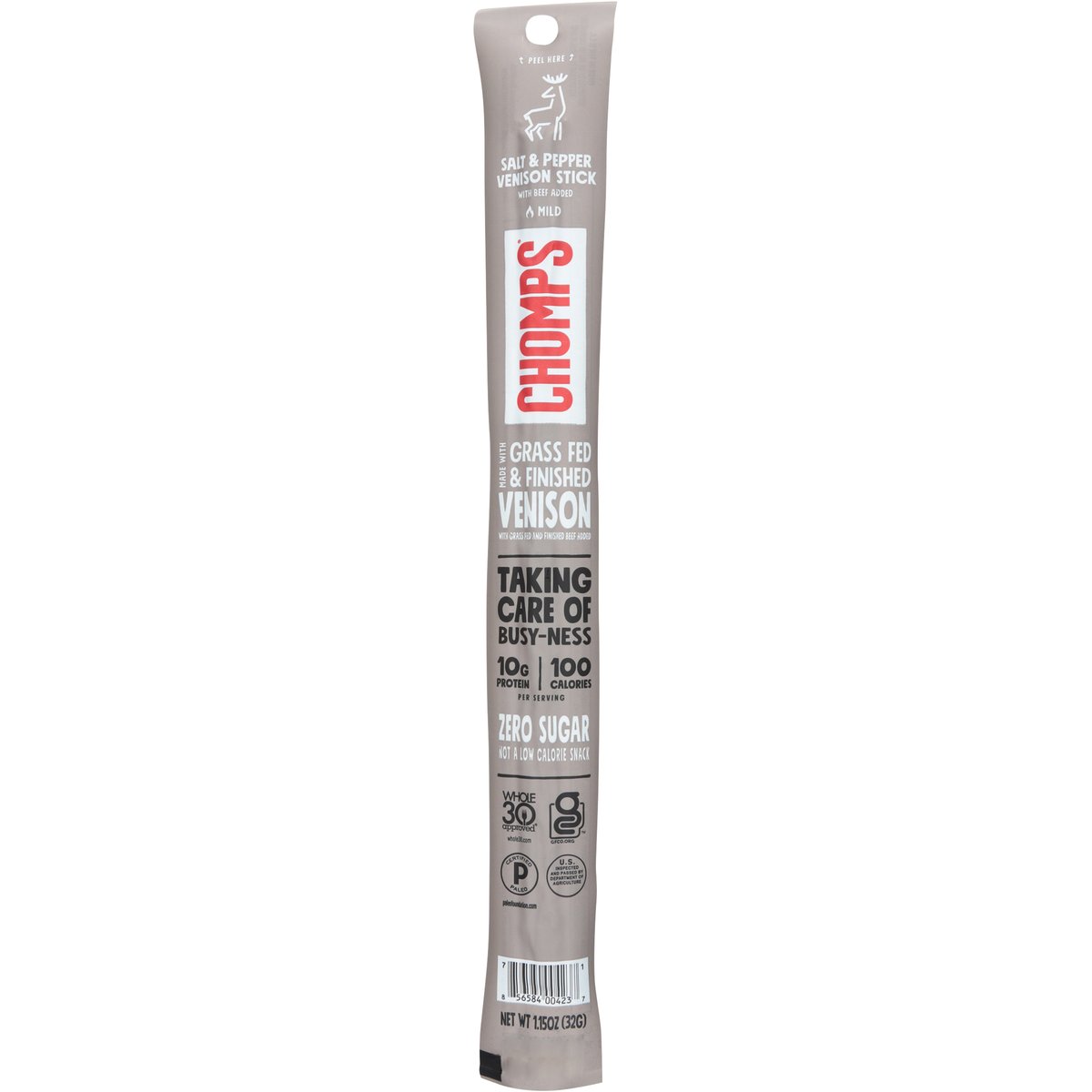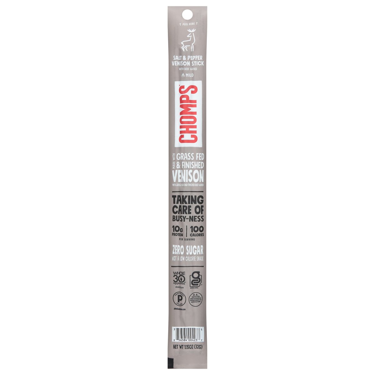 Salt & pepper venison stick with beef added. Per Serving: 10 g protein; 100 calories. Certified gluten free. gfco.org. Certified Paleo. paleofoundation.com. Zero sugar. Made without: milk, egg, fish, crustaceans shellfish, tree nuts, wheat, peanuts, soybean and sesame. Not a low calorie snack. Taking care of busy-ness. Venison & Beef raised without antibiotics or added hormones* and fed a vegetarian diet. Color may vary due to the cooking process. No nitrates or nitrites added. Except those naturally occurring in cultured celery powder and sea salt. *Federal regulations prohibit the use of hormones in venison. Whole 30 Approved. U.S. inspected and passed by Department of Agriculture. chomps.com. paleofoundation.com. Instagram. Facebook. @chomps. Questions? Concerns? Hit us up at team@chomps.com or chomps.com. Made in the USA.