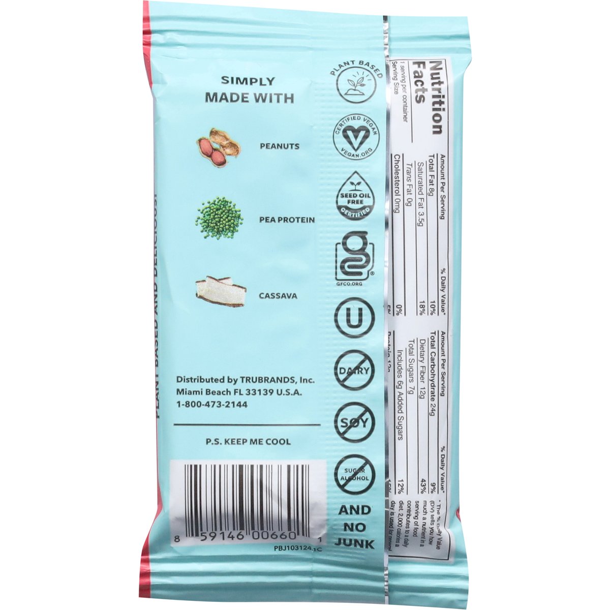 190 calories. 12 g protein. 12 g fiber. Certified gluten free. gfco.org. Certified vegan. Vegan.org Non-GMO Project verified. nongmoproject.org. Yeah... It's a protein bar. No gluten. No dairy. No soy. No seed oils. No dairy. No soy. No seed oils. No sugar alcohols. All delicious. Seed oil free certified. And no junk. Plant based and delicious! trubar.com. Join us at trubar.com.