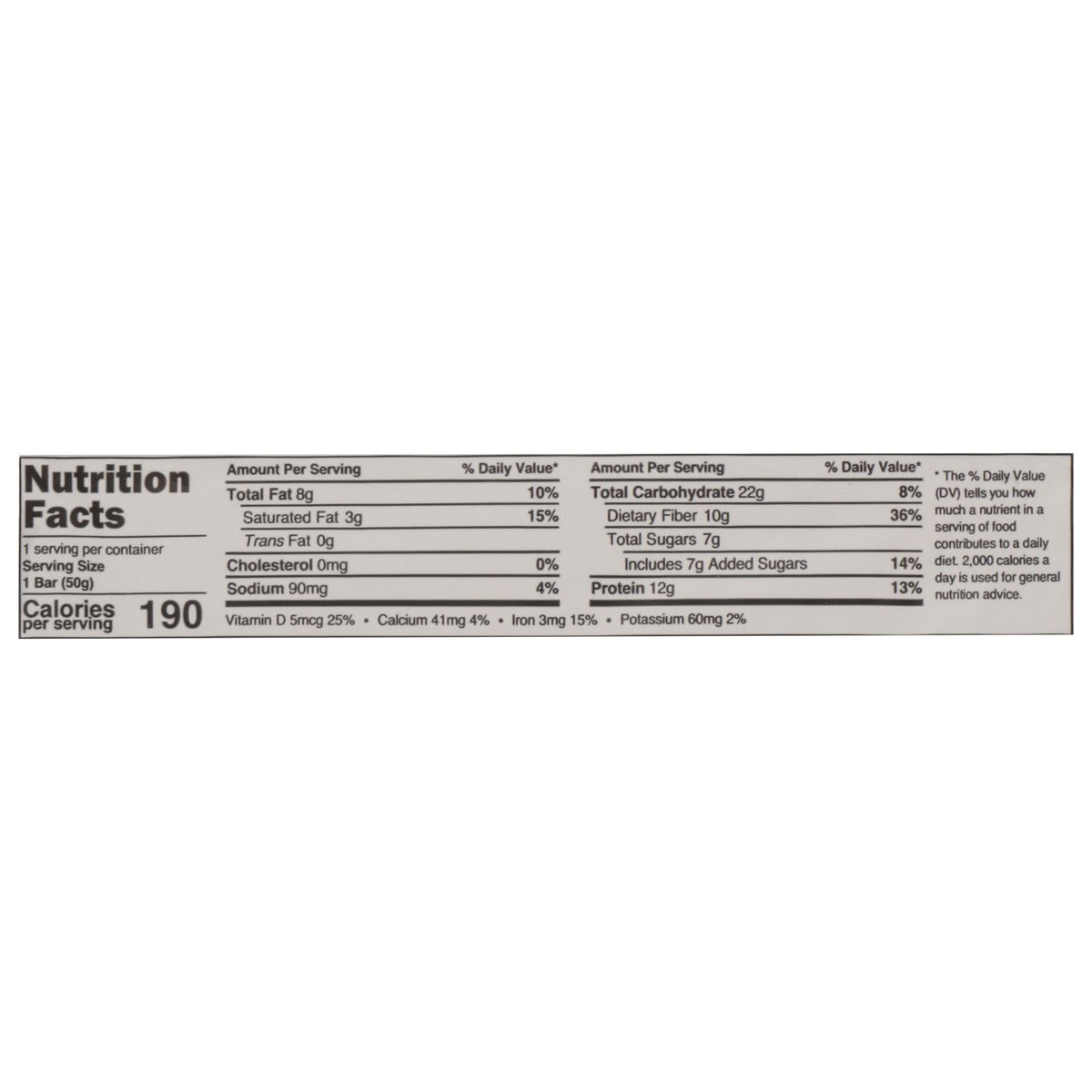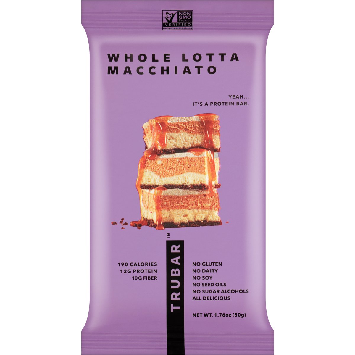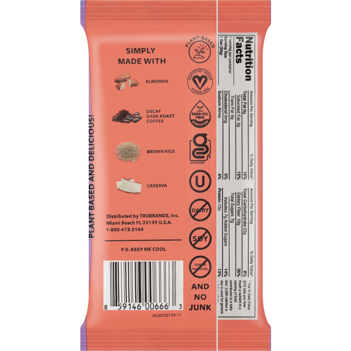 190 calories. 12 g protein. 10 g fiber. Certified vegan. Vegan.org. Certified gluten free. gfco.org. No dairy. Non-GMO Project verified. nongmoproject.org. Yeah...It's a protein bar. No sugar alcohols. And no junk. Plant based and delicious! Certified: Seed oil free. trubar.com. Join us at trubar.com.