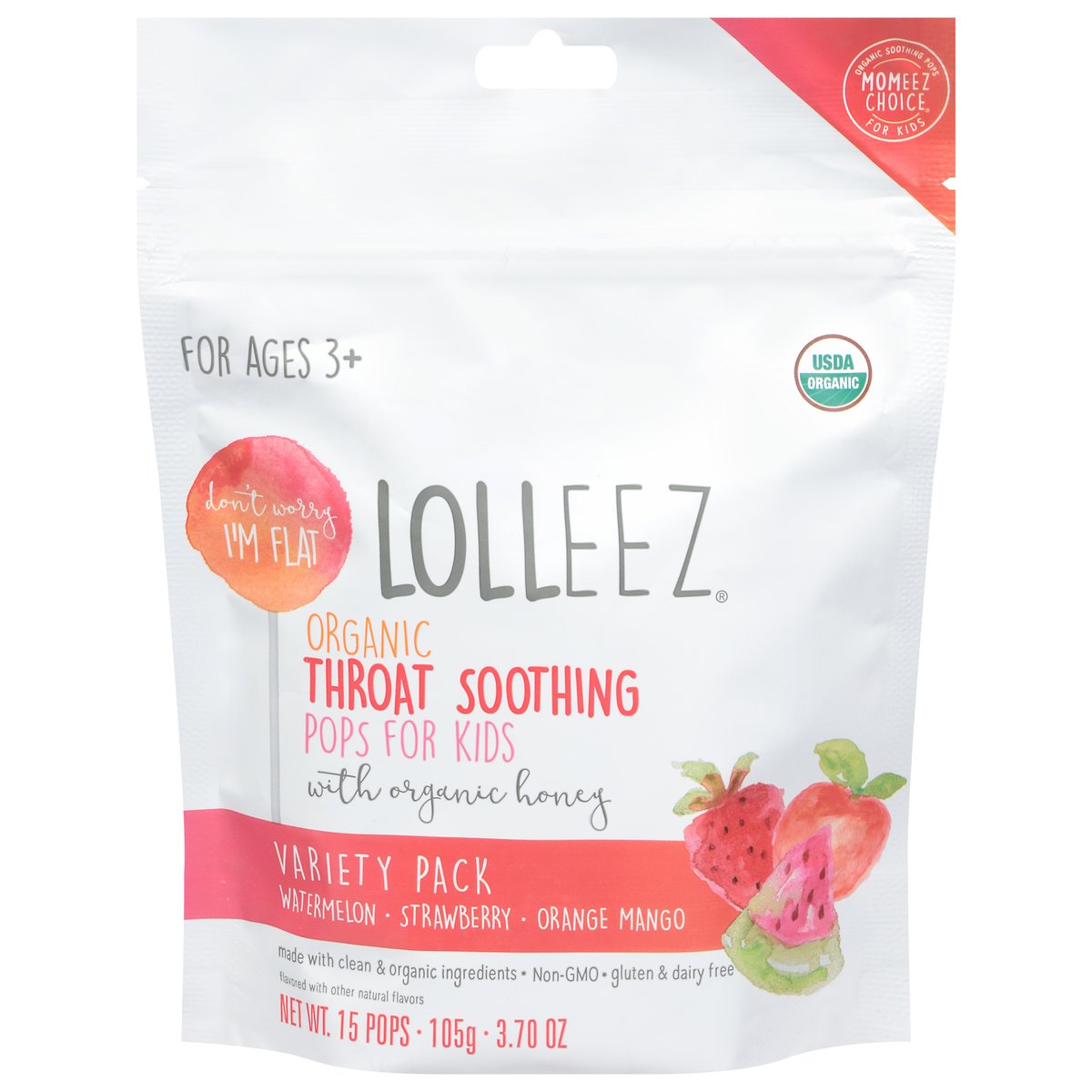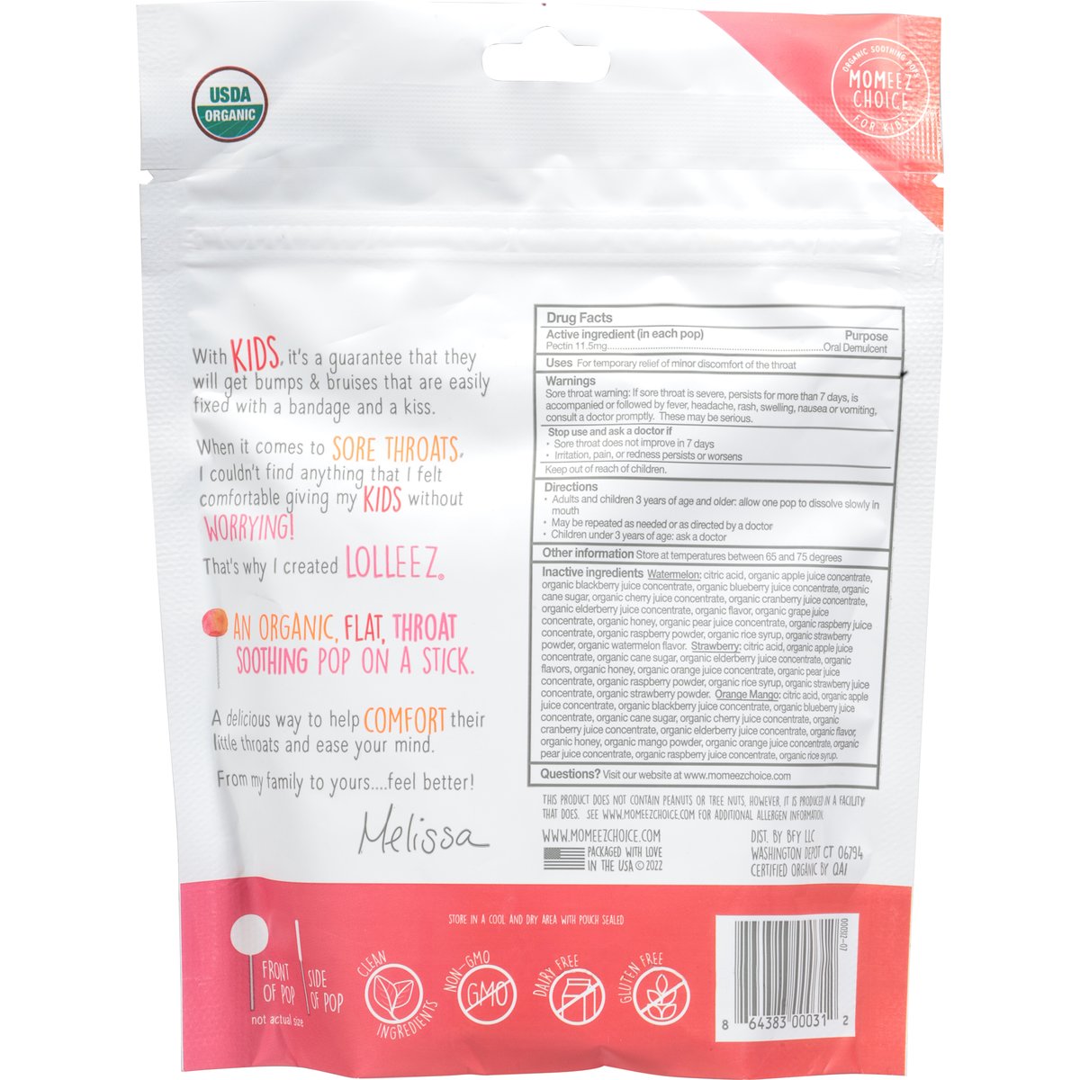 In Each Pop Other Information: Store at temperatures between 65 and 75 degrees. Store in a cool and dry area with pouch sealed. In Each Pop Other Information: Store at temperatures between 65 and 75 degrees. Store in a cool and dry area with pouch sealed. In Each Pop Other Information: Store at temperatures between 65 and 75 degrees. Store in a cool and dry area with pouch sealed. For ages 3+. Organic throat soothing pops for kids with organic honey. Watermelon, Strawberry, Orange Mango. Flavored with other natural flavors. Watermelon/Strawberry/Orange Mango: USDA Organic. Non-GMO. Don't worry I'm flat. With kids, it's a guarantee that they will get bumps & bruises that are easily fixed with a bandage and a kiss. When it comes to sore throats. I couldn't find anything that I felt comfortable giving my kids without worrying! That's why I created Lolleez. An organic, flat, throat soothing pop on a stick. A delicious way to comfort their little throats and ease your mind. From our family to yours. Feel better! Melissa. Front of pop. Side of pop. Clean ingredients. www.momeezchoice.com. Questions? Visit our website at www.momeezchoice.com. See www.momeezchoice.com for additional allergen information. Packaged with love in the USA.