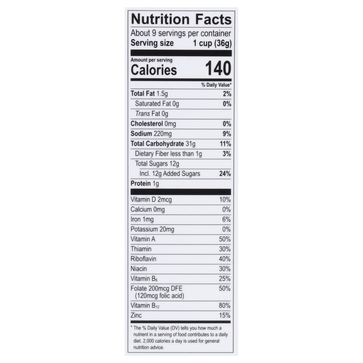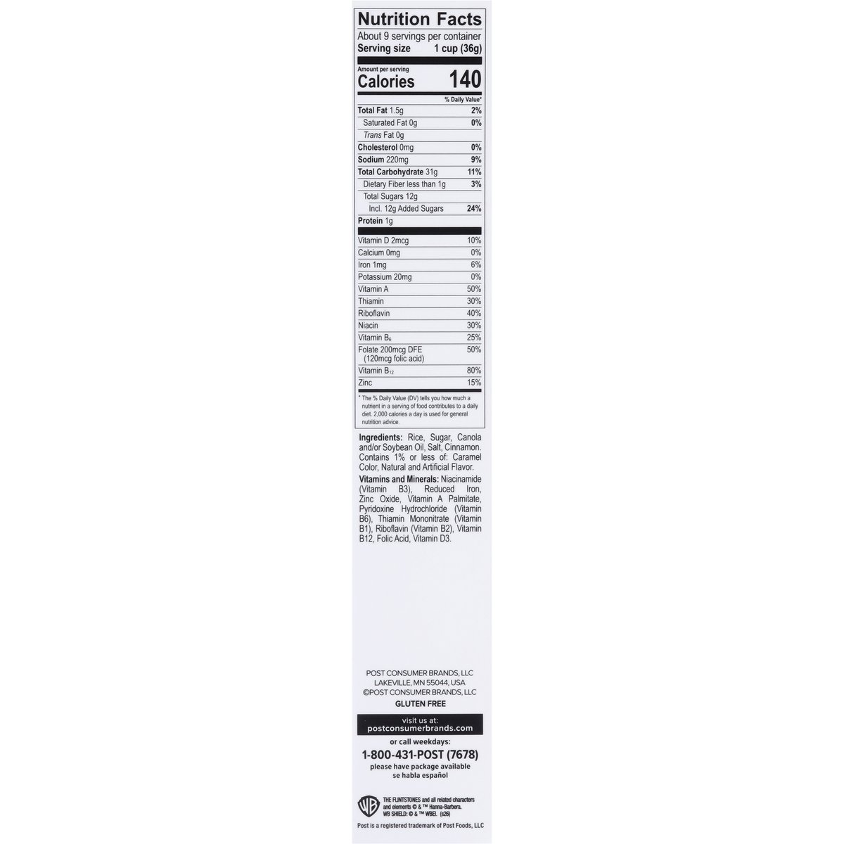 Sweetened rice cereal with cinnamon. Per 1 Cup Serving: 140 calories; 0 g sat fat (0% DV); 220 mg sodium (9% DV); 12 g added sugars (24% DV). Gluten free. New. Great cinnamon taste! postconsumerbrands.com. how2recycle.info. Visit us at: postconsumerbrands.com or call weekdays: 1-800-431-Post (7678) please have package available. Certified 100% recycled paperboard.