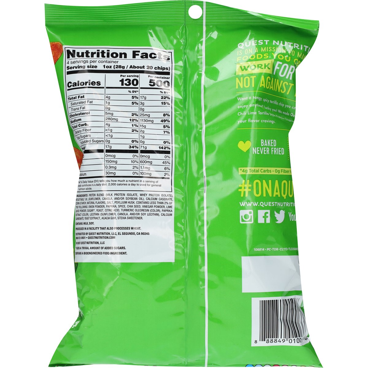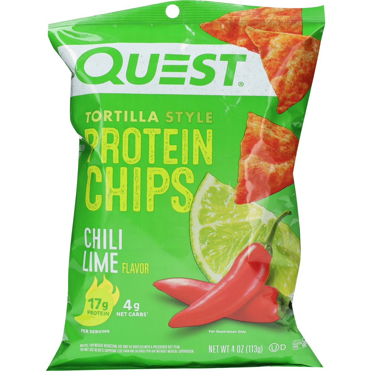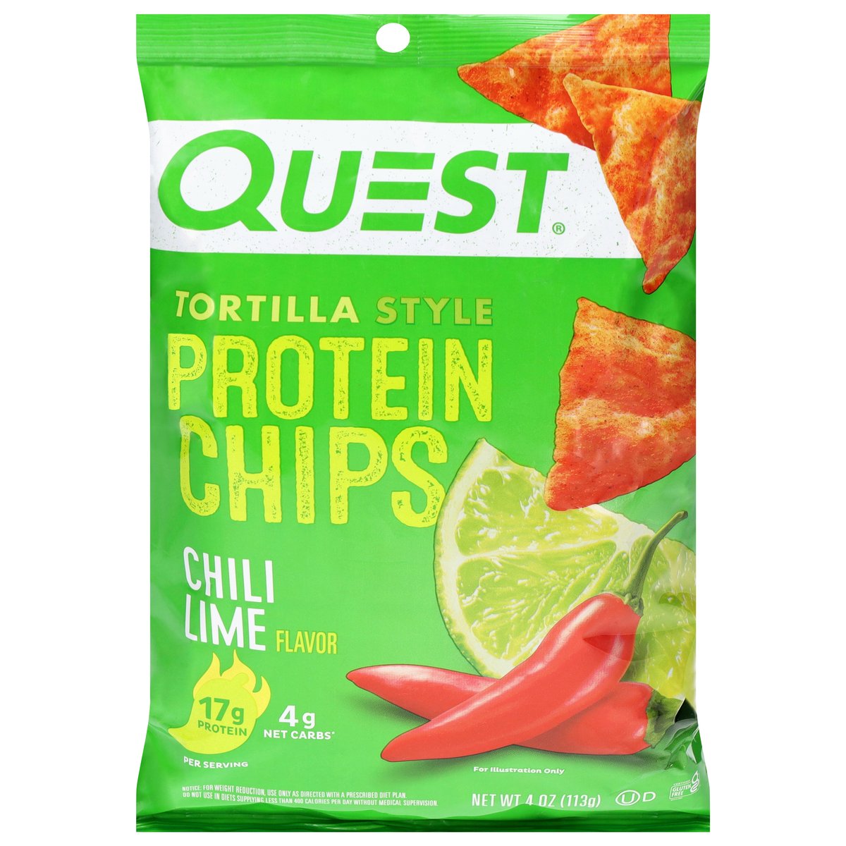 Per Serving: 17 g protein. 4 g net carbs*. * 4 g carbs - 0 g fiber = 4 g net carbs. Certified gluten free. gfco.org. Gluten free. Contains bioengineered food ingredients. Quest Nutrition is on a mission to make the foods you crave work for you not against you. Want a tangy, tortilla chip you can enjoy anytime? Lucky you! We made Quest Chili Lime Tortilla Style Protein Chips to feed your flavor cravings. Baked never fried. www.questnutrition.com. #onaquest. Instagram. Facebook. Twitter. YouTube.